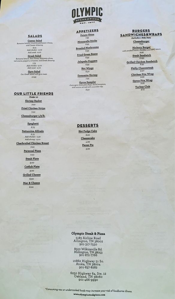 Welcome to Olympic Steak & Pizza - Millington, a hidden gem nestled in the heart of Millington, Tennessee. With a mouthwatering menu that beautifully blends indulgent steaks and handcrafted pizzas, this restaurant stands out as a destination for casual dining that caters to diverse tastes and preferences. Located at 8500 Wilkinsville Rd, Millington, TN 38053, Olympic Steak & Pizza not only offers a welcoming atmosphere but also provides a range of convenient services including delivery, takeout, and reservations, making it a perfect spot for any dining occasion.
